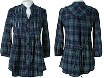 Romeo & Juliet Couture plaid shirt features vintage-inspired details and sweet, puff sleeves. The split mandarin collar drops to a button-down front and is accented by see-through insets of crochet on the bust. The edges of the bust and back neck are detailed with ruffle trim. The three-quarter length sleeves are gathered at the shoulder and at the banded opening to create a "puffed" look. This loose fitting shirt pleats at the empire waistline and drops to a slightly flared bodice. Side ties extend from the waist.